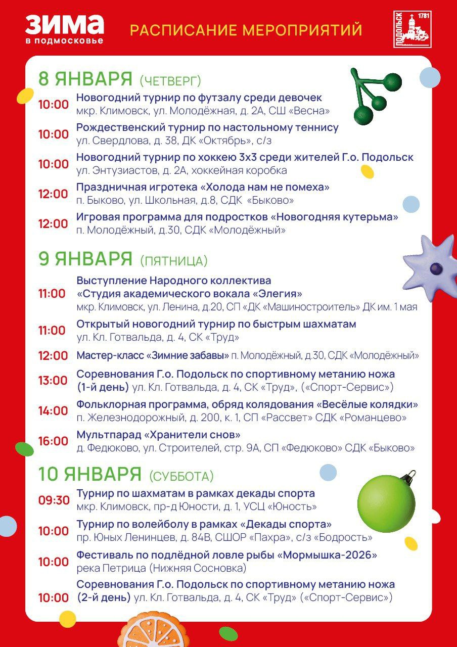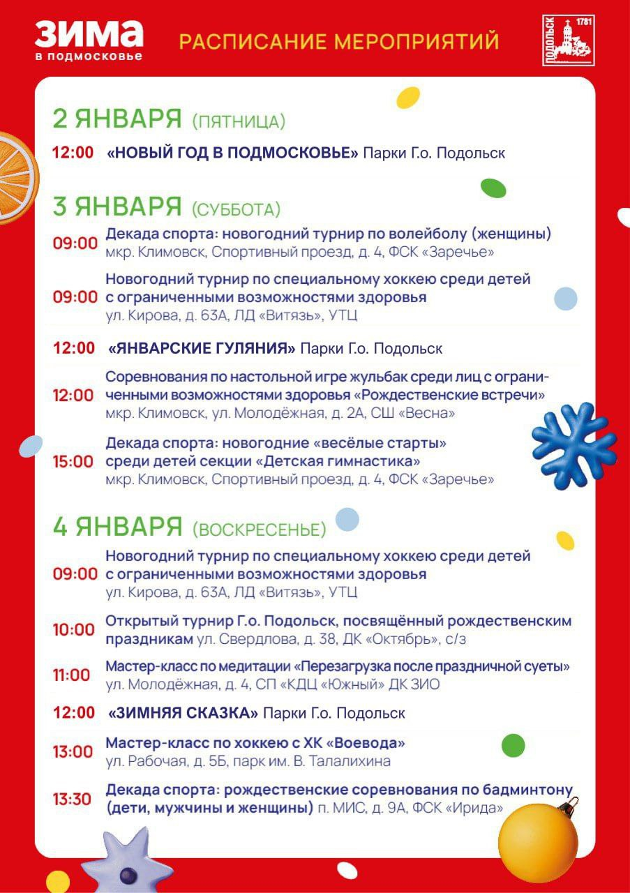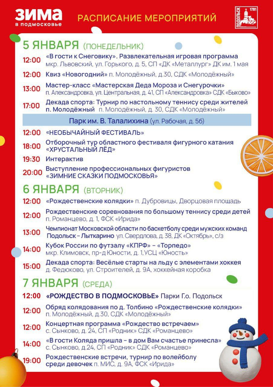 5 января в парке Талалихина состоится «НеобыЧАЙный» фестиваль. Кроме того, в этот день откроется этап областного фестиваля «Хрустальный лед»: в Подольск приедут как начинающие фигуристы, так и мастера мирового класса, в их числе заслуженный мастер спорта, серебряный призер зимних Олимпийских игр Илья Авербух.
