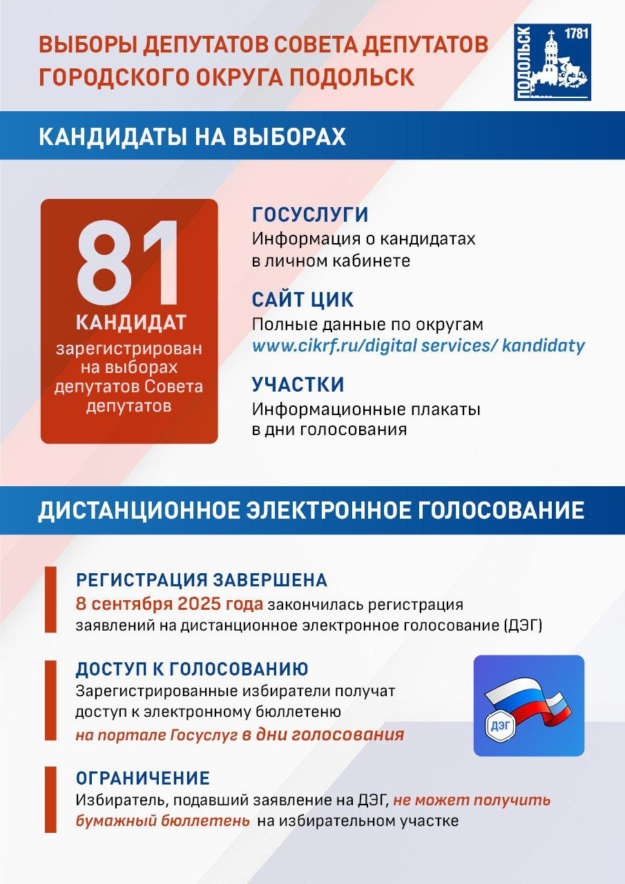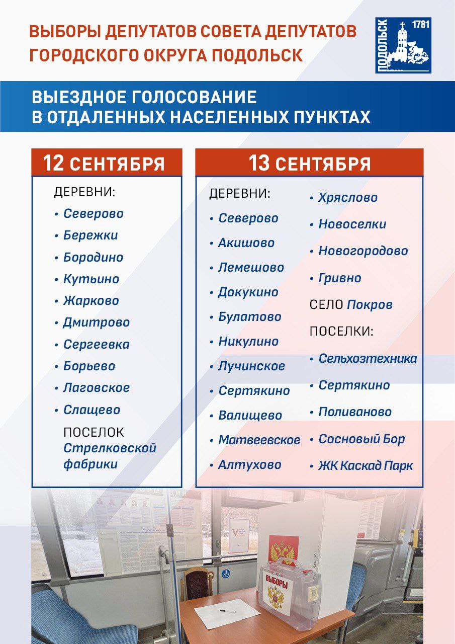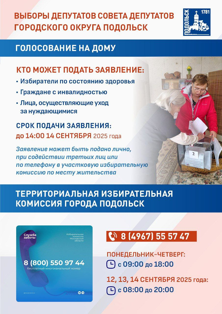 Для более чем 16 000 подольчан, зарегистрировавшихся на дистанционное электронное голосование, бюллетень будет доступен онлайн. Те, кто по состоянию здоровья или другим причинам не сможет прийти на участок, могут проголосовать на дому — заявление необходимо подать до 14:00 14 сентября. В населенных пунктах без стационарных помещений для голосования отработают выездные комиссии.